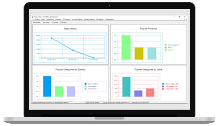 Cc Retail Express dashboard displays user-friendly graphs of sales history, assisting sales managers to make informed decisions. It allows users to view sales data for the past 7, 15, and 30 days, popular products are displayed in a graphical bar chart.